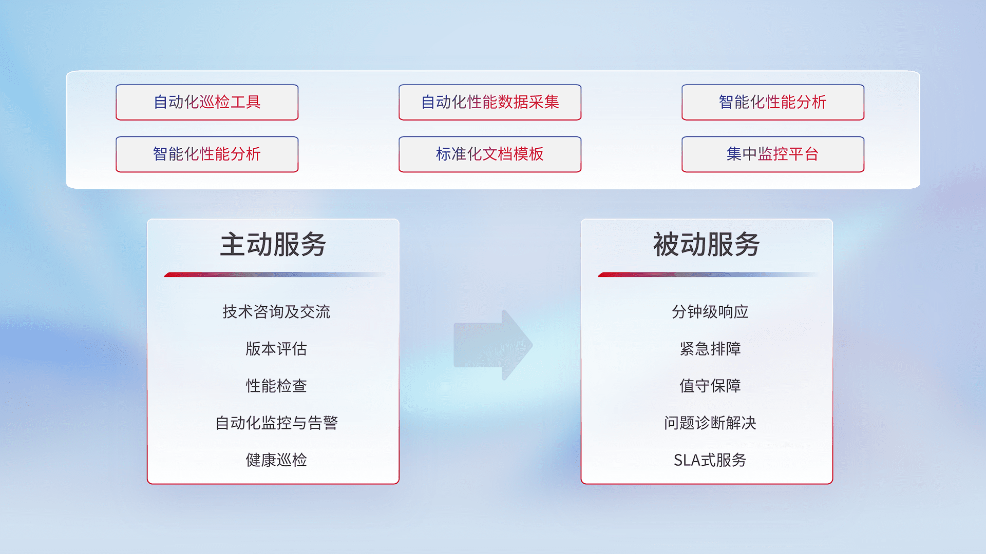 智能化工具和标准化文档,,保障服务质量,,提供主动服务(包含技术咨询、、版本评估、、性能检查、、、、自动化监控与告警、、、健康巡检)和被动服务包含(分钟级响应、、紧急排障、、值守保障、、问题诊断解决、、、SLA服务)。。。